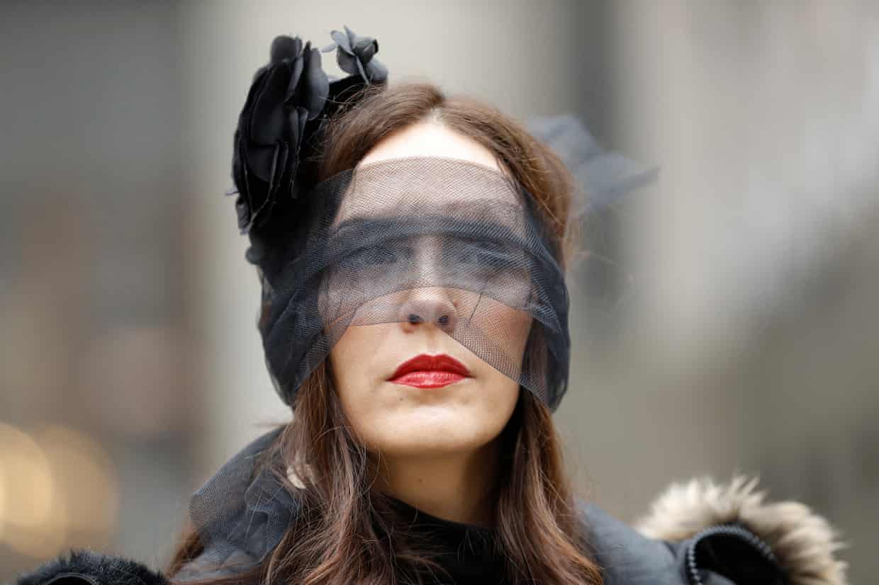 | A woman inspired by the Chilean feminist group called Las Tesis protest in front of the NYC’s criminal court during Harvey Weinstein’s trial. Photograph: John Lamparski/Echoes Wire/Barcroft Media |